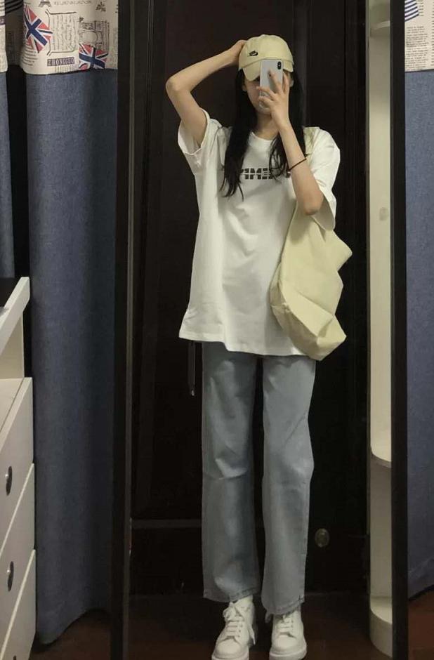 天气很热,选择T恤是很正常的。超级简单的T恤,别担心太花哨了,带上帆布袋。你是一个新鲜干净的盐女孩。